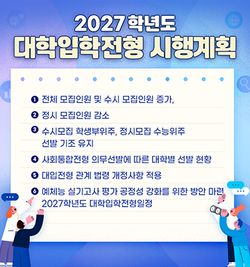 - 수시모집의 85.8%를 학생부위주 전형으로, 정시모집의 92.7%를 수능 위주전형으로 선발