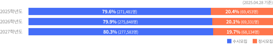 - 수시모집:79.6% (271,481명), 정시모집:20.4% (69,453명)