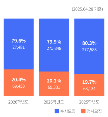 - 수시모집:80.3% (277,583명), 정시모집:19.7% (68,134명)